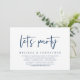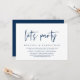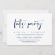 Cartão de convite de elopamento de casamento com tema de script azul naval moderno (Vamos festejar). É perfeito para o seu jantar de elopamento de casamento casual à beira do lago, dança e festa.