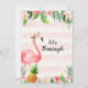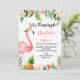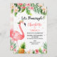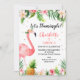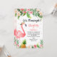 Vamos Tropical Floral Flamingle Aniversário Convite para vamos coloridos, convite de aniversário flamingos, com um grande flamingo, folhagem tópica e flores e um ananás. A design também apresenta um balão em forma de coração.