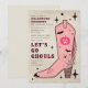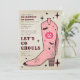 Convites de festas de fantasia de Halloween com figuras decorativas cor-de-rosa e pretas "Vamos Ir Ghouls" e "Halloween Hoedown", ilustração da teia e das estrelas, e botas de vaqueiro cor-de-rosa decoradas com jack ou lanterna, morcegos, estrelas, teia e aranha. O fundo está esbranquiçado.
