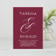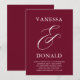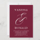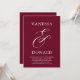 Convite moderno para casamento, com um layout simples e mínimo com seus nomes e um computador elegante em um formato grande acima dos detalhes do evento. O tema de cores é burgundy e pode ser alterado na ferramenta de edição de design.
