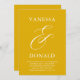 Convite moderno para casamento, com um layout simples e mínimo com seus nomes e um computador elegante em um formato grande acima dos detalhes do evento. O tema de cor é amarelo-mostarda e pode ser alterado na ferramenta de edição de design.