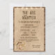 Você é procurado no convite de aniversário temático ocidental com um design de safra angustiado, botas de vintage, chapéu e corda em um pergaminho de madeira perfeito para uma festa do oeste selvagem. Personalize-o da forma que você quiser.