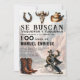 Celebrar um marco de 100º aniversário de um homem com este Desert Lasso Vaquero Western Cowboy Espanhol 100º Aniversário Convite para Homens. Perfeito para um Texas e para um adulto mexicano no sudoeste do Texas. Apresentando sotaques clássicos do oeste selvagem: um chapéu de cowboy, botas de cowboy, ferradura rústica, crânio de touro, e cowboy jogando uma corda de lasso, tudo em um fundo de montanhas do deserto. Perfeito para um primavera ou festa de verão, fez 100 anos para ele. Edite este modelo de convite de 100 anos editável com seus próprios detalhes de evento. Disponível para pedidos em impressão ou download digital para envio via texto ou mídia social ou para impressão em casa.