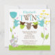 Comece o chá de fraldas dos gêmeos com o nosso doce bife de roupa de bebê... com o convite de chá de fraldas para uma combinação de dois filhos. Nosso convite para chás de fraldas múltiplos para gêmeos jovens apresenta um coelho bonito sentado em um gramado com flores azuis e amarelas com duas roupas de casaco de bebê azul, verde limão e castanho. Coordenando bolinhas marrons e verdes limões de volta. Visite nosso compro por correspondência obrigado cartões de nota, autocolantes e selos de correio Os fatos para bebês são © Erin Bradley Designs