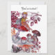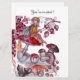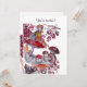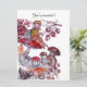 Folheto mágico colorido e extravagante de bosques encantados sentado em um cogumelo vermelho cercado por folhas roxas, amarelas e marrons de outono, castanhas, frutas vermelhas. Pintura em aquarela 2010 por Alessandro Lumini. Design elegante, sofisticado e único, fácil de personalizar como convite de casamento, anúncio de núpcias, cartões de mesa, agradecimento, chá de bebê, festas de aniversário infantil, chá de noiva, festa de 16 anos, aniversário, chá de noivado romântico, Natal, feriado, escritório, reuniões de família, celebrações de Ano Novo, encontros, formaturas escolares, concerto, recital ou qualquer outro evento que você desejar!
