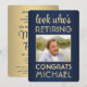 Olha quem está se aposentando! Convide colegas, colegas de trabalho, familiares e amigos para uma celebração especial de aposentadoria com convites de festas de fotos elegantes e personalizados. O quadro e toda a redação desta modelo são simples de personalizar. (DICA DE IMAGEM: Uma maneira fácil de posicionar uma foto exatamente como você deseja é recortá-la antes de carregá-la no site do Zazzle.) O marinho azul e ouro moderno apresenta uma foto do aposentado, um fundo azul escuro ombre, folha de ouro falso, caligrafia por na moda e tipografia clássica da arte de vintage. Observe que o ouro é impresso a cor, não a folha metálica. A design neutra do ponto de vista do gênero também é adequada para um homem ou para uma mulher. Saúde, Parabéns e boa aposentadoria!