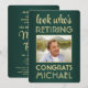 Olha quem está se aposentando! Convide colegas, colegas de trabalho, familiares e amigos para uma celebração especial de aposentadoria com convites de festas de fotos elegantes e personalizados. O quadro e toda a redação desta modelo são simples de personalizar. (DICA DE IMAGEM: Uma maneira fácil de posicionar uma foto exatamente como você deseja é recortá-la antes de carregá-la no site do Zazzle.) O design verde e dourado moderno mostra uma foto da aposentada, um fundo verde ombre, caligrafia com na moda e tipografia clássica da arte de vintage. Observe que o ouro é impresso a cor, não a folha metálica. A design neutra do ponto de vista do gênero também é adequada para um homem ou para uma mulher. Saúde, Parabéns e boa aposentadoria!