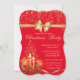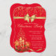 Um convite elegante para festas de férias com uma árvore de Natal dourada, arco, confete, velas em fundo vermelho. Estes belos convites de Natal são perfeitos para convites de festas de janto de Natal, convites para troca de presentes de Natal, angariadores de fundos de Natal, convites para bolas de férias e outros eventos realizados durante o mês de dezembro. Use apenas os campos modelo para adicionar suas próprias informações de evento.