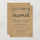 Coma, beba, e é casado -- Convites rústicos do casamento do país do estilo do vintage -- Swirly, os rolos encaracolado e a tipografia da velho-forma na antiguidade original envelheceram o fundo do pergaminho do ecru. Adicione seus nomes e informação wedding neste modelo fácil de usar. Elegante mas divertimento e lunático, a caligrafia do roteiro do estilo do quadro pode ser alterada para seu tema retro formal ou semi-formal do casamento. O estilo moderno ocasional é perfeito para casamentos contemporâneos na moda com um toque do divertimento de encanto sofisticado para os noivos tradicionais. Contacte-nos por favor para a ajuda com personalização se você precisa a sala adicional para seus detalhes do casamento. Outros tamanhos e estilos do quadro disponíveis.