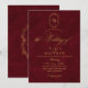 Elegante na moda burgundy e um convite de casamento dourado moderno com uma elegante letra manuscrita com caracóis e um monograma da noiva e do noivo. Clássico e elegante, simples e moderno convite.