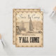 Há um toque de hospitalidade ao sul neste design de casamento temático do país excelente que tem um grande "Y'all Come" e apresenta uma fotografia em tons de sépia de um celeiro e equipamento agrícola no fundo. Personalize usando o modelo fácil para digitar seus próprios nomes e data e detalhes no verso. Procure ID651 para ver todos os produtos correspondentes neste design de casamento.
