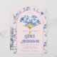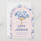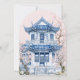 Este convite de festas de chá tem uma design de chinoiserie apresentando um ventilador azul e branco sobre um fundo rosa. A borda arcaica tem um padrão floral azul em um fundo cor-de-rosa pincelado. As costas têm um grande pagode.