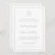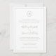 Simples Convite de Casamento com seu monograma em um círculo no topo e seus detalhes de casamento cercados por uma fina fronteira. Seus nomes estão em uma fonte elegante de script manuscrito. Todos os elementos de design são verdes em sábado sobre um fundo branco e podem ser alterados na ferramenta de edição de design. O esquema clássico e tradicional faz este excelente de convite para um casamento formal.