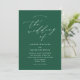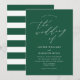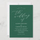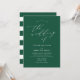 Convide convidados para a celebração do casamento com nossos convites para casamento da Calliografia Minimalista. Os simples e elegantes convites para o casamento mostram os detalhes do casamento em branco, acentuados por lindos escritos em caligrafia contra um fundo verde da floresta. A parte traseira apresenta faixas verdes e brancas. A design faz parte da nossa coleção de casamento da Calliografia Minimalista.
