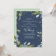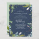 Este convite de casamento azul-marinho com verde de verão é perfeito para um casamento elegante de verão. O design botânico apresenta um arranjo exuberante de eucalipto pintado à aquarela, folhagens e folhas verdes com delicados ramos de flores cor-de-rosa em um fundo azul-marinho.