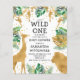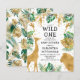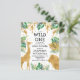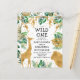 Este convite para chás de fraldas, chamado "selvagem", contém folhas falsas de ouro (girafa, leão e macacos), folhagem dourada e selva verde, e uma aspersão de confete de ouro sobre fundo branco. Adicione o nome da futura mãe e os detalhes do chá em texto preto. Um padrão de folhagem em verde e dourado em fundo branco decora a parte de trás da carta.
