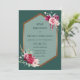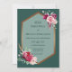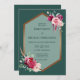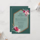 Um convite divertido e na moda boho com um quadro geométrico dourado contra um fundo verde escuro. O quadro é acentuado por rosas de burlões, peônias cor-de-rosa e penas. Seus nomes e detalhes aparecem em uma fonte segura e sofisticada. A parte traseira apresenta seus nomes em um plano de cores de cheio.