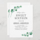 Personalize este moderno Watercolor Greenery Eucalyptus Foliage Primavera Style Sweet XVI Convite de aniversário sobre fundo branco com sua mensagem e detalhes. Este convite para na moda inclui folhagem botânica elegante e moderna, cinzenta verde-verde, com tipografia de na moda é perfeita para as celebrações de Festa de aniversário Doce 16