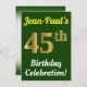 Este design convite de aniversário apresenta uma mensagem como "A 45ª Celebração de Aniversário de Jean-Paul!", onde o nome pode ser personalizado, e onde o número "45º" tem uma aparência falsa de ouro. Ele também apresenta um fundo de cor verde. Os detalhes do evento no verso podem ser personalizados. Poderia ser usado para convidar pessoas para a festa ou festa de aniversário de 45 anos de alguém. [~Z0000121]