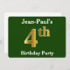 Este design de convite apresenta o número normal "4º" com uma aparência falsa em forma de ouro. Também apresenta um nome personalizado e um fundo de cor verde. Os detalhes do evento no verso podem ser personalizados. Poderia ser usado para convidar pessoas para a quarta festa de aniversário de alguém. [~Z0000013]