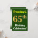Este design convite de aniversário apresenta uma mensagem como "A 65ª Celebração de Aniversário do Francisco!", onde o nome pode ser personalizado, e onde o número "65º" tem uma aparência falsa de ouro. Ele também apresenta um fundo de cor verde. Os detalhes do evento no verso podem ser personalizados. Poderia ser usado para convidar pessoas para a festa ou festa de aniversário de alguém do sexagésimo quinto aniversário. [~Z0000121]