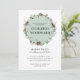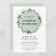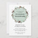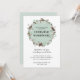 Um convite de chá de bebê único com tema de mamãe abelha, apresentando abelhas e uma grinalda floral botânica de eucalipto e algodão. Verde menta em branco.