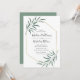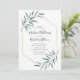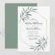 Elegante convite de casamento moderno, com detalhes de seu casamento cercado por uma falso moldura geométrica de folha de ouro com folhas de cor d'água enfeitando os cantos. O verso apresenta um fundo verde sólido. Projetado para coordenar com a nossa coleção de casamento do Modern Greenery.