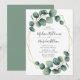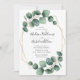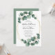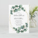 Elegante convite de casamento moderno, com detalhes de seu casamento cercado por uma falso moldura geométrica de folha de ouro com folhas de cor d'água enfeitando os cantos. O verso apresenta um fundo verde sólido. Projetado para coordenar com a nossa coleção de casamento do Modern Greenery.