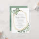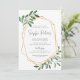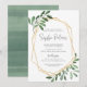 Os bonitos convites para bebês neutros em termos de gênero incluem a inscrição de cinzas enquadrada por uma falsa borda geométrica dourada e folhagem verde-escura, folhas e bagas brancas. Uma escolha moderna num esquema natural de cores para os chás de fraldas do tipo boho ou da natureza.