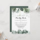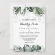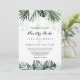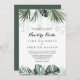 Este convite para uma nuestra branca verde tropical é perfeito para um casamento de destino. A design apresenta palmeiras verdes folhas buquês com flores brancas adoráveis.