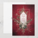Este deslumbrante design de convite de casamento apresenta uma estética dramática e elegante, dominada por um fundo vermelho profundo vibrante com uma textura sutil e desgastada. Uma forma de brasão geométrico central é emoldurada por uma linha metálica dourada fina, fornecendo um ponto focal sofisticado para o texto. A moldura é ricamente adornada com arte botânica altamente detalhada, apresentando abundante folhagem em tons de verde floresta profundo, salva e musgo. Aglomerados de minúsculas flores brancas e delicados ramos de folhagem em tons dourados enfatizam o sentimento romântico e opulento. O tema geral é o de um luxuoso jardim de inverno ou uma celebração formal de feriado, perfeito para um casamento de outono ou inverno grandioso, um evento sofisticado à noite ou uma festa festiva. Esta papelaria requintada também é adequada para um gala formal de aniversário ou um anúncio corporativo de férias chique. O design gracioso deste convite também pode ser facilmente adaptado para anúncios de abertura de negócios, folhetos de lançamento de produtos de alta qualidade, conv