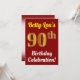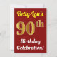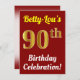 Este design de convite de festa de aniversário apresenta uma mensagem como "Celebração dos 90 anos de Betty-Lou!", onde o nome pode ser personalizado, e onde o número "90" tem uma aparência semelhante a ouro falso. Ele também apresenta um fundo de cor vermelha. Os detalhes do evento no verso podem ser personalizados. Ele pode ser usado para convidar as pessoas para a celebração de aniversário de noventa anos ou festa de aniversário de alguém.