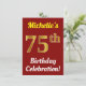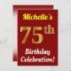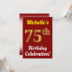 Este design de convite de aniversário apresenta uma mensagem como "A 75ª Celebração de Aniversário da Michelle!", onde o nome pode ser personalizado, e onde o número "75º" tem uma aparência de ouro falso. Ele também apresenta um fundo de cor vermelha. Os detalhes do evento no verso podem ser personalizados. Pode ser usado para convidar pessoas para a festa ou festa de aniversário de alguém do aniversário de setenta e cinco anos. [~Z0000120]
