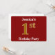 Este design de convite apresenta o número ordinal "1rua" com uma aparência falsa em ouro. Também apresenta um nome personalizado e um fundo vermelho. Os detalhes do evento no verso podem ser personalizados. Poderia ser usado para convidar pessoas para a primeira festa de aniversário de alguém. [~Z0000012]