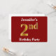 Este design de convite apresenta o número ordinal "segundo" com uma aparência falsa em forma de ouro. Também apresenta um nome personalizável e um fundo vermelho. Os detalhes do evento no verso podem ser personalizados. Poderia ser usado para convidar pessoas para a segunda festa de aniversário de alguém. [~Z0000012]