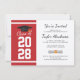 Adicione seu ano de graduação, nome e detalhes do local com data para este moderno fundo vermelho e branco negrito com convite de festa de formatura de tipografia negra usando nosso botão "Personalizar" acima