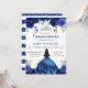 Um convite sonhador de Quinceañera em azul, apresentando uma linda princesa de cabelos pretos em um vestido de baile fluido, cercada por flores azuis e roxas exuberantes, borboletas e folhagens em aquarela suave. Um delicado motivo de tiara coroa o design, enquanto a tipografia elegante de fontes mistas destaca os detalhes da celebração com um toque moderno e feminino. A rica paleta azul, os detalhes florais suaves e a silhueta graciosa da princesa criam um convite mágico e sofisticado, perfeito para uma celebração inesquecível de Quinceañera.