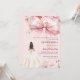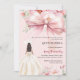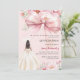 Um elegante fundo rosa, decorado com um grande laço rosa, flores rosa e uma menina em um vestido bege. Personalize e adicione um nome e detalhes da festa.