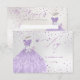 Cartão de RSVP de quinceañera elegante da PixDezines com vestido rosa poeira brilhante, borboletas rosa dourado e lilás, e flores doce lilás. Fundo iridescente com filtros para ajuste de tom. Todos os elementos são editáveis. Direitos autorais © 2010-2022, PixDezines™. Todos os direitos reservados.