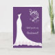 Vestido de noiva branco e espirais em fundo roxo cartão de pedido de damas de honra. Você pode ajustar o texto de acordo com suas necessidades.