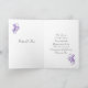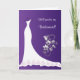 Vestido de noiva branco, borboleta floral prateada em um cartão de pedido de damas de honra de fundo roxo.