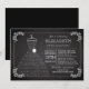 Convite único e moderno para chá de panela de noiva, apresentando um vestido de noiva branco em um cabide emoldurado com uma bela e elegante moldura de folhas, colocado em um fundo preto. O vestido de noiva tem as palavras "aqui vem a noiva" escritas nele e uma flor na cintura. Vire o convite para encontrar uma cor de fundo correspondente para um toque extra especial. Elegante e contemporâneo, com um toque de vintage, o convite do vestido de noiva bonito está disponível em nossa loja em outras combinações de cores populares.