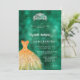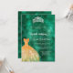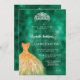 Um convite moderno, na moda e glamouroso para uma Quinceañera, festa de aniversário 15. Um fundo verde esmeralda estudado com ouro falso um vestido e uma tiara prateada falsa. O nome é escrito com um moderno estilo escrito à mão. Personalize e adicione os detalhes da sua festa.