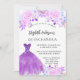 Um convite moderno, na moda e glamouroso para uma Quinceañera, festa de aniversário 15. Um fundo branco com flores cor-de-rosa pinceladas, um vestido de bola roxo. O nome é escrito com um moderno estilo escrito à mão. Personalize e adicione os detalhes da sua festa.