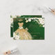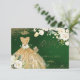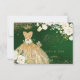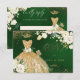 RSVP de quinceanera elegante da PixDezines apresentando um vestido com lantejoulas em fundo verde esmeralda e dourado com flores em aquarela em rosas de Alabastro / creme e folhagem verde exuberante, .