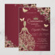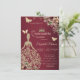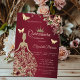 Tiara de lantejoulas douradas, vestido, borboletas e flores em um fundo vermelho. Convide os convidados para se juntarem a você na celebração deste marco com um design que reflete a magia e a alegria do seu quinceañera.