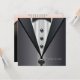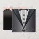 Convite de smoking preto elegante com camisa branca e gravata borboleta preta na frente e um vestido preto sem alças com colar de diamantes no verso. Este é um modelo de convite de festa ou evento versátil para qualquer festa ou ocasião especial. O design da frente e do verso também está disponível em envelopes. Convites de evento de black tie, convites de festa corporativos, convites de aniversário, coquetel, jantar, festa de casamento, convites de noivado.