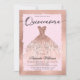 Convite de Quinceañera elegante com folha rosa dourada e brilho, apresentando vestido rosa dourado e moldura rosa dourada com elementos cintilantes. Personalize com detalhes da festa em letras maiúsculas modernas.