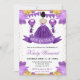 Este belo convite de Quinceanera apresenta uma princesa morena com um vestido roxo brilhante, cercada por rosas, balões e detalhes dourados cintilantes. A rica paleta roxa e a ilustração de uma princesa de contos de fadas criam uma atmosfera luxuosa e mágica, enquanto os acentos florais e cintilantes adicionam um toque de elegância. Perfeito para celebrar este marco único na vida com um visual feminino, encantador e refinado.