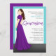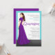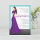 Purple & turquoise Quinceañera marco convites de aniversário com ilustração de uma morena com cabelos longos vestindo uma tiara e um lindo vestido roxo real, para o aniversário do 15 de sua filha.